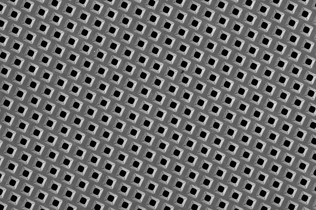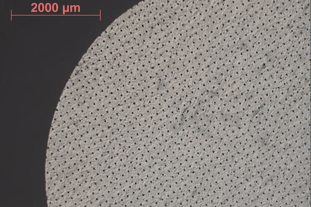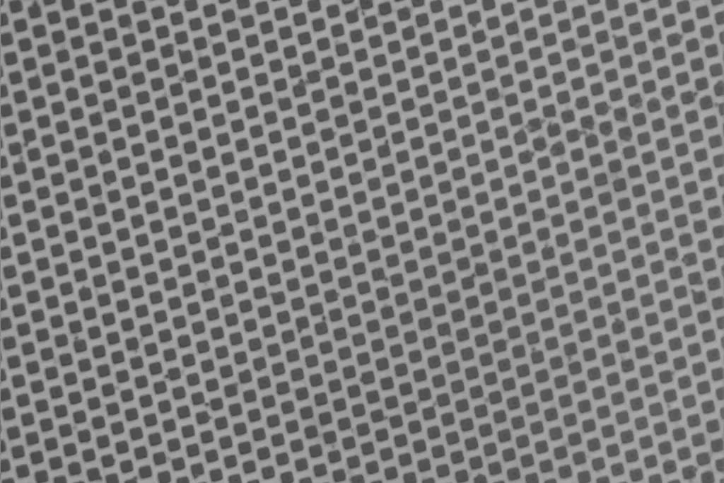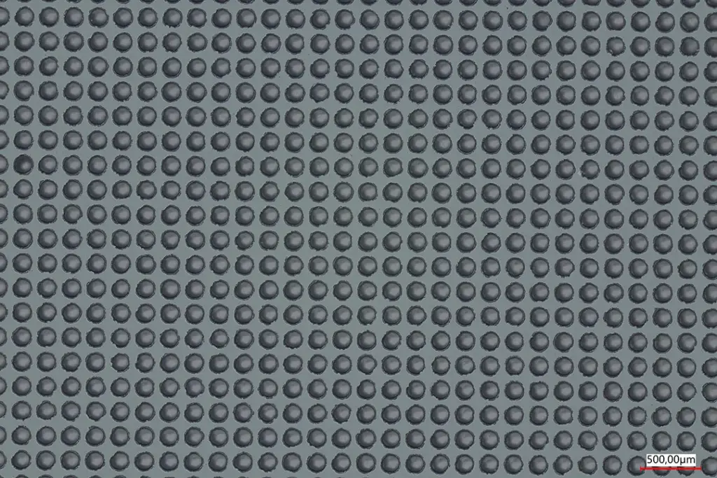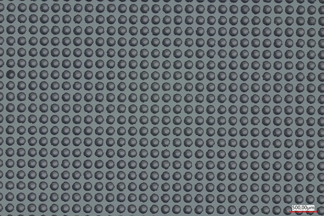 Je nach Auslegung können die Poren in quadratischer oder trigonaler Anordnung realisiert werden. Die laserbasierte Strukturierung erlaubt eine hohe strukturelle Homogenität über die gesamte aktive Filterfläche hinweg.