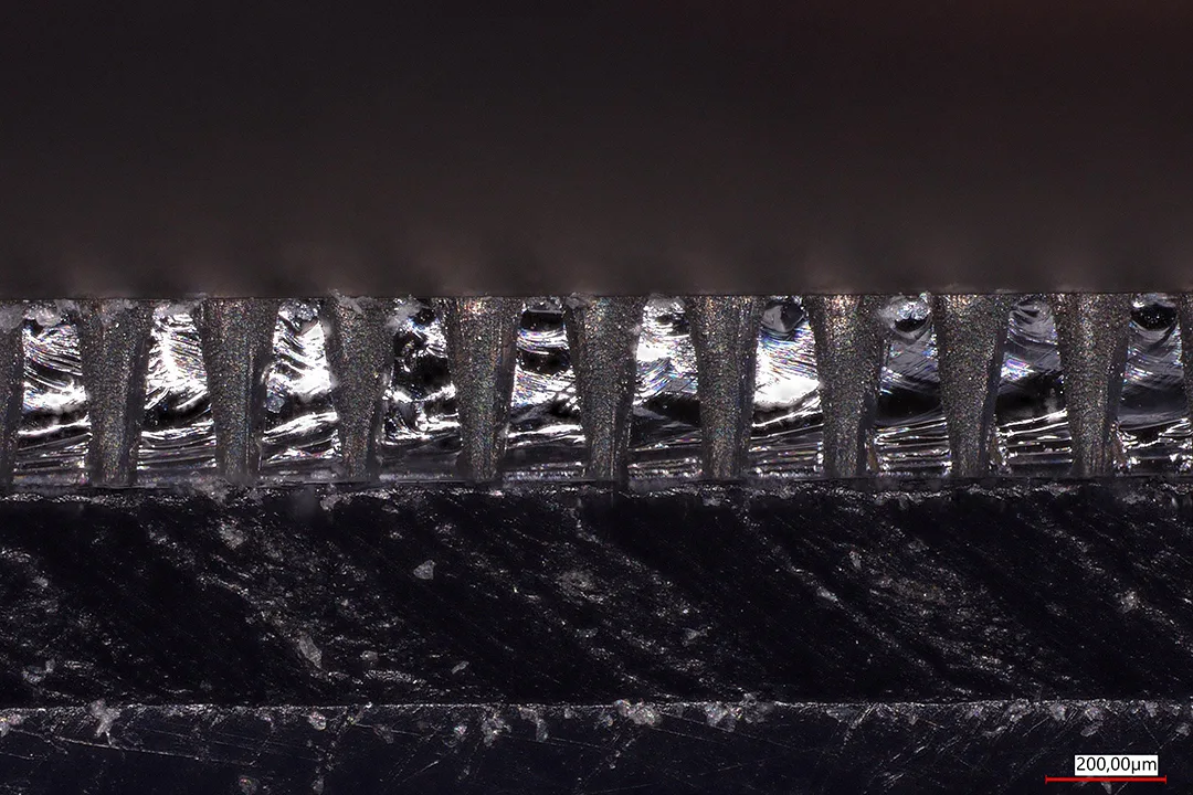 Die Poren werden mittels präziser Laser-Mikrobearbeitung erzeugt, wodurch Porendurchmesser, Geometrie, Anordnung und Porenabstände gezielt definiert werden können. Die Poren sind dabei grundsätzlich konisch ausgeführt, sodass sich unterschiedliche Porendurchmesser auf der Lasereintritts- und Laseraustrittsseite ergeben. Dadurch entstehen zwei funktional unterschiedliche Membranseiten, die ein definiertes Strömungsverhalten und eine kontrollierte Filtration ermöglichen.