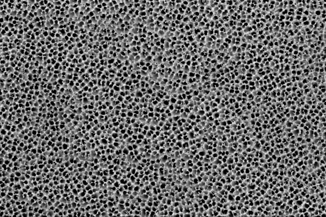 Die Poren sind innerhalb der jeweiligen Korngrenzen des Aluminiums trigonal angeordnet, wodurch eine regelmäßige, hochgeordnete Porenstruktur entsteht. Diese definierte Geometrie ermöglicht eine präzise Trennschärfe und macht die SmartPor-Membranen besonders geeignet für anspruchsvolle analytische Anwendungen, bei denen eine enge Porengrößenverteilung entscheidend ist.